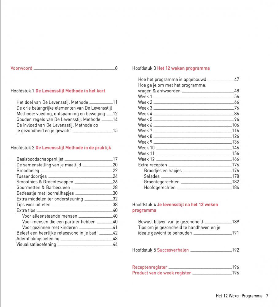 Het boek leidt je met een overzichtelijk weekprogramma door De Levensstijl Methode heen. Hierin komen alle drie de elementen van de methode terug. In twaalf weken tijd zit De Levensstijl Methode in je systeem en wordt het automatisme. Je levensstijl dus!