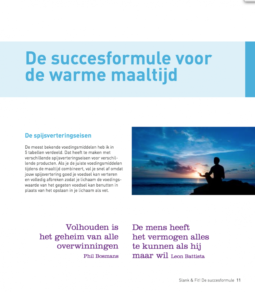 Bij deze methode zorgt de juiste samenstelling van je maaltijden voor een goede spijsvertering en stofwisseling waardoor je op een gezonde natuurlijke manier gaat afvallen. Daarnaast bevordert deze methode jouw gezondheid en conditie. Je krijgt meer energie, je voelt je fitter en je straalt het uit.